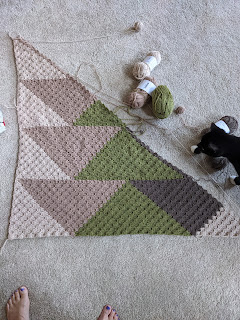 But I am making them an afghan. It's a corner to corner crochet pattern called Stacked Triangle by Living the Craft Life. I'm using Knit Picks Wool of the Andes in worsted weight. I added one extra column to each triangle to make it just a wee bit bigger. I'm hoping it will be big enough that both of them can snuggle under it while watching television.